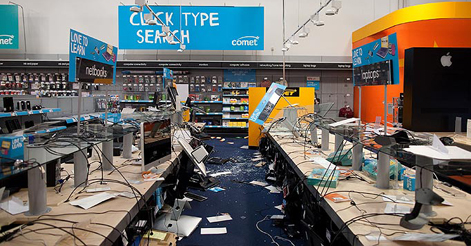 It has also taken the shape of a wave of socialism, which has swept through the high streets redistributing wealth, transforming shops into great piñatas to be exploded, with TVs, iPods, trainers, mobile phones, jewellery, chemist products, carpets, and booze of various grades and descriptions being transferred from shops to local residents in thousands of unrecorded transactions, at all hours of the night and day, without need for shop assistance.
