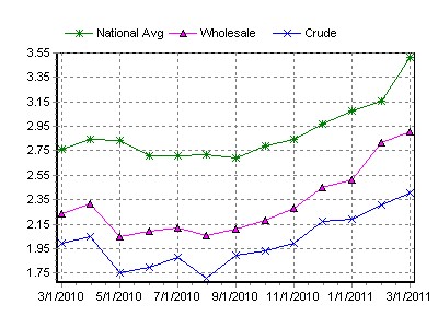 The speculators applaud! The media casually blames the price hikes on Gaddafi... "Households are cutting back on travel, cinema visits and groceries in the UK, where prices jumped to 130.68 pence a liter ($8.06 a gallon) on March 3, ... Prices set records in the Netherlands and Italy. ( Record Gas Prices: $8 In Europe, $4 In California; Trichet Could Raise Interest Rates To Halt Inflation | Markets | Minyanville.com, March 4, 2011)